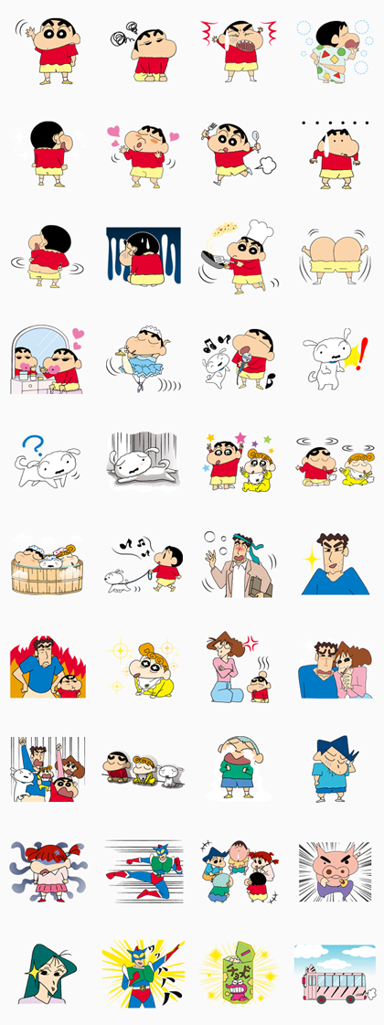 蠟筆小新終於來到貼圖小舖囉!貼圖內除了小新以外,還有許多圍繞在他身邊的家人、好友等各種角色。您也快來加入他們的行列吧!